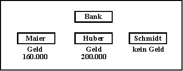 Herr Maier hat Herrn Schmidt insgesamt Gter und Dienstleistungen im Wert von DM 100.000 abgekauft, Herr Huber im Wert von DM 60.000,-. Das fhrt zu einer entsprechenden Verminderung des Geldes von Maier und Huber, und zu einer entsprechenden Erhhung des Geldes von Schmidt. Es kommt beim Kauf nur zu einer Verschiebung des Geldes - es wird aber kein Geld neu geschaffen, noch geht Geld aus dem Wirtschaftskreislauf verloren. Die gesamte Geldmenge der Volkswirtschaft betrgt weiterhin DM 400.000,-.