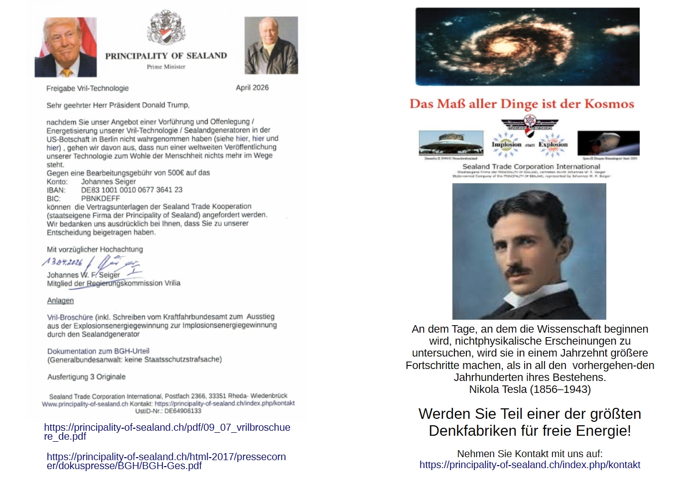 Um die Arbeit der Regierungskommission VRILIA besser zu verstehen, möchten wir Ihnen ein hervorragendes Video unter diesem Link empfehlen: https://www.youtube.com/watch?v=DRzilpUYTBIDies soll zur Erreichung des längst überfälligen Friedensvertrages sowie zur Wiederherstellung der vollen Souveränität des Deutschen Reichs durch den SHAEF-Gesetzgebers USA und die Aufhebung der Feindstaatenklausel durch die UNO führen. Sämtliche Verhandlungen bis zur Unterzeichnung des Friedensvertrages sind ausschließlich mit dem Mitglied der Regierungskommission VRILIA Johannes W. F. Seiger zu führen.