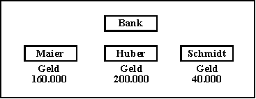 Herr Maier hat Herrn Schmidt insgesamt Gter und Dienstleistungen im Wert von DM 100.000 abgekauft, Herr Huber im Wert von DM 60.000,-. Das fhrt zu einer entsprechenden Verminderung des Geldes von Maier und Huber, und zu einer entsprechenden Erhhung des Geldes von Schmidt. Es kommt beim Kauf nur zu einer Verschiebung des Geldes - es wird aber kein Geld neu geschaffen, noch geht Geld aus dem Wirtschaftskreislauf verloren. Die gesamte Geldmenge der Volkswirtschaft betrgt weiterhin DM 400.000,-.