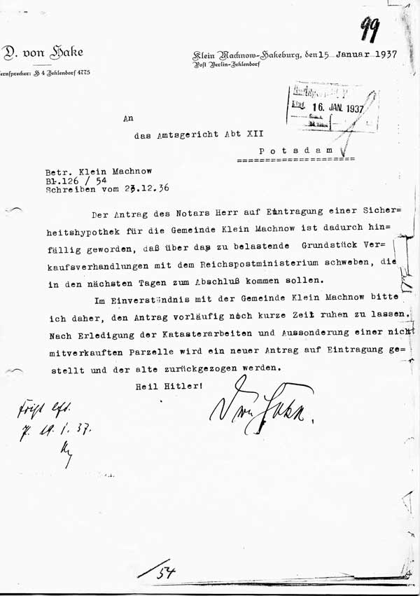 01 Schreiben des Eigentümers D. von Hake an das Amtsgericht (AG) Potsdam: Ankündigung des Verkaufs an die Deutsche Reichspost, vom 15. Jan. 1937