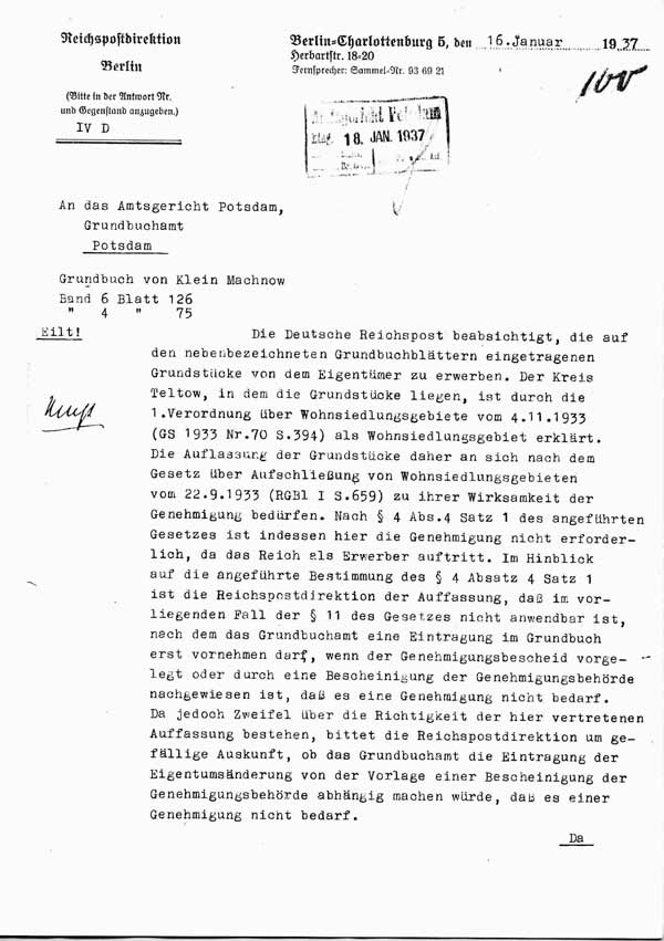 02 Schreiben des Reichspostministeriums an das Amtsgericht Potsdam: Kaufabsicht und Frage, ob Genehmigung gern. Reichssiedlungsgesetz erforderlich [#1, #2] vom 16. Jan. 1937