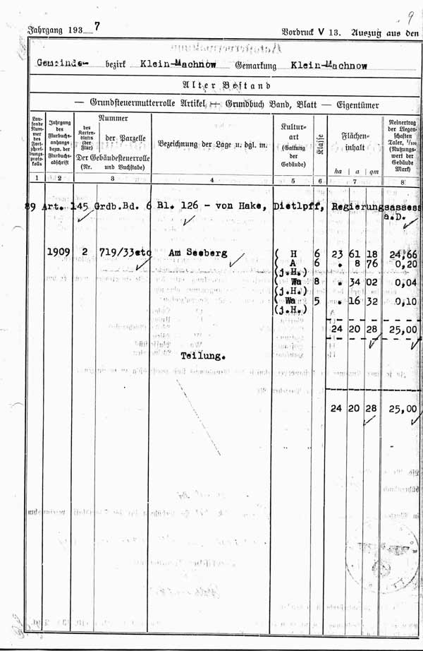 04 Katasterauszug [Auszug aus den Grundsteuerfortschreibungsverhandlungen] des Spandauer Weg (Parz. 6656/33) und Grundbuch Band 6, Blatt 126: Eigentümer D. von Hake [#1 #2 ] vom 29. Jan. 1937
